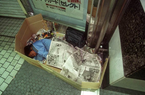 Quel est le symbole le plus fort de la décennies perdues au Japon ? les SDF. Inexistants depuis pendant la période de la reconstruction et la haute croissance, ces déclassés du travail, des retraités pauvres et ces travailleurs misérables sont apparus dans les rues de Tokyo. Si le phénomène est beaucoup moins massif qu'en Occident, il a marqué l'oeil du photographe Michael Wolf qui a saisi ces moments graves où se mêlent décalage, abandon et aussi grande noblesse de ces oubliés.